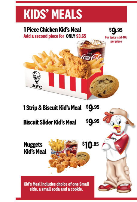 Each Kid’s Meal includes choice of the following: One side: Fries, Mashed Potatoes or Macaroni & Cheese / Beverage: Juice Box or Soda.
